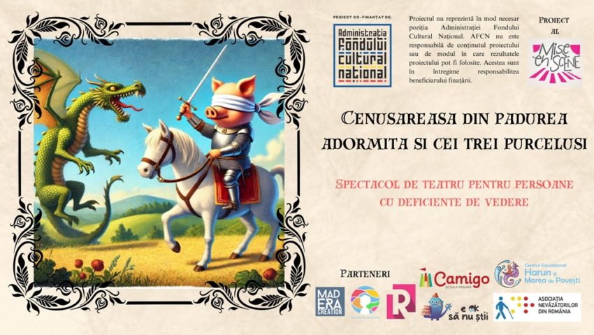 Cenuşăreasa din pădurea adormită şi cei trei purceluşi nu este o poveste pentru copii. Este un spectacol aparte, creat de o echipă mixtă de actori văzători şi nevăzători, care explorează problemele reale şi provocările cu care se confruntă persoanele cu deficienţe de vedere.