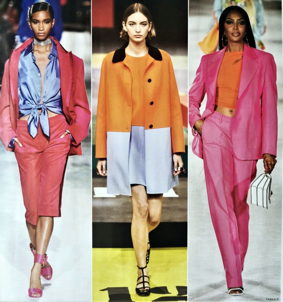 Avem și culoare, căci tendința colour block continuă și în acest sezon: alăturări de fuchsia cu orange sau cu violetul vedetă cel propus de Pantone – despre care a vorbit tot internetul – Very Peri, sau galben acidulat în asociere cu verde chartreuse sau vermillon, desigur pentru temperamentele curajoase cărora nu le este teamă să fie observate.