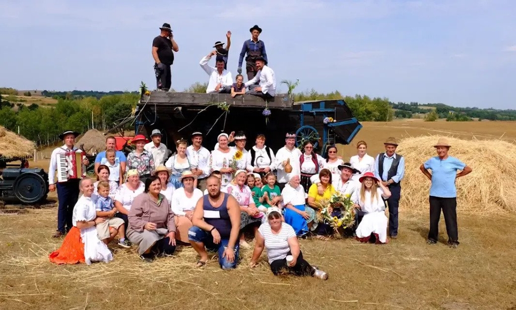 Secerișul a început aici în forță. Totul este manual, se cosește cu coasa, cu mâna. În spate se aude batoza, care deja se încălzește pentru a treiera aceste snopuri, legate de femei. Toată lumea e bucuroasă, se cântă. Așa este la slovaci: se cântă tot timpul – și la coasă, și la lucru, și la bucurie, și la supărare. Noi încercăm să reînviem tradiția și să arătăm și altora cum s-a trăit aici, la Șinteu.