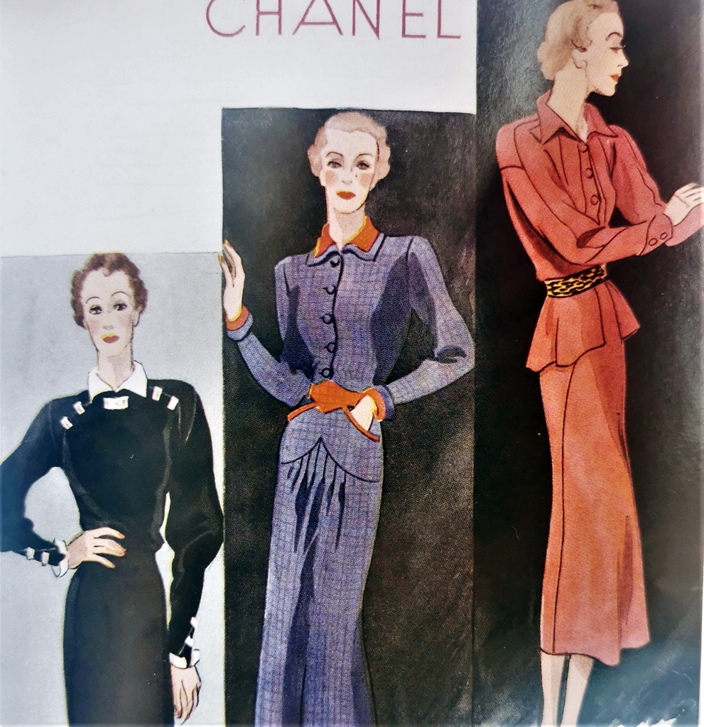 Primul costum Chanel, într-o variantă acordată vremurilor de-atunci, s-a născut pe la mijlocul anilor ‘20, confecționat din tweed și cașa și era reprezentat printr-o fustă relativ largă care permitea mișcarea firească în mers, o jachetă bordată la gât cu blană și o bluză de mătase satinată.