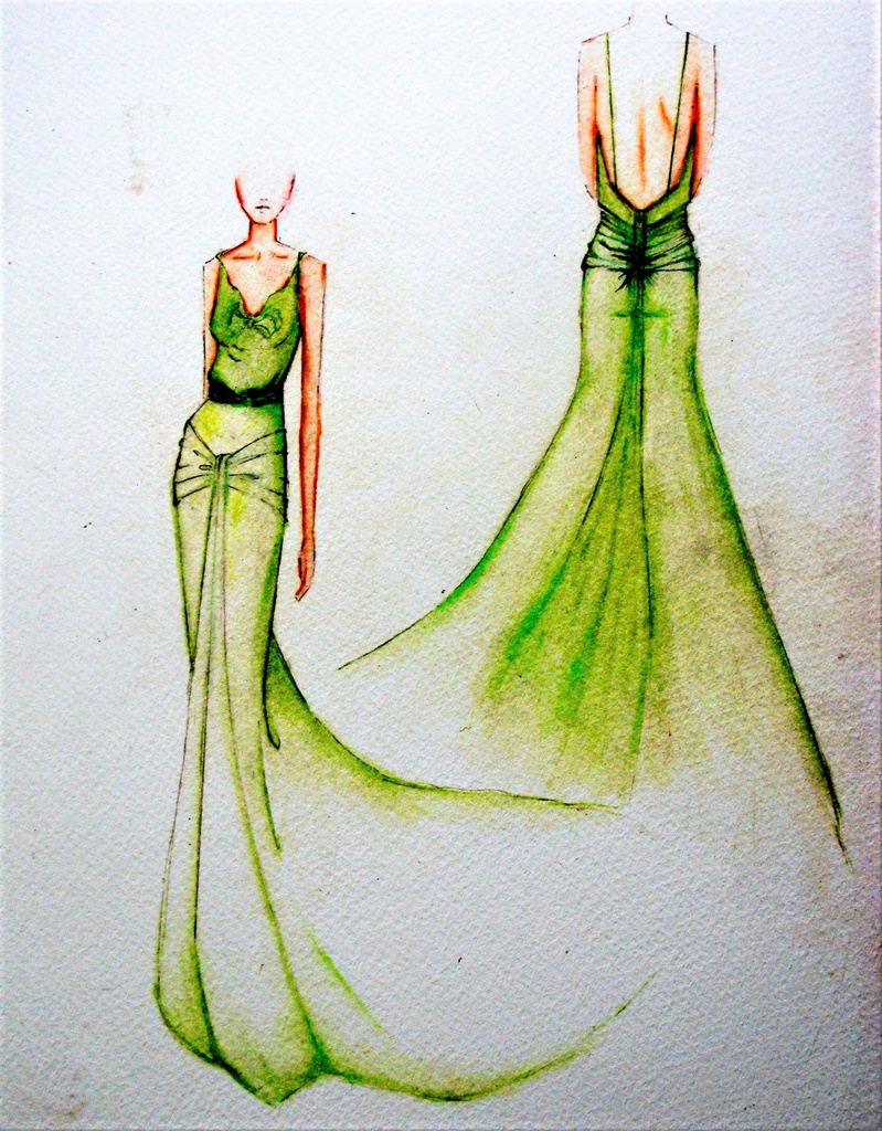 Inspirată din creațiile Chanel, așa cum a precizat creatoarea, cromatica sa era gândită să sugereze ideea de răcoare în timpul verii toride alături de spatele gol al rochiei.