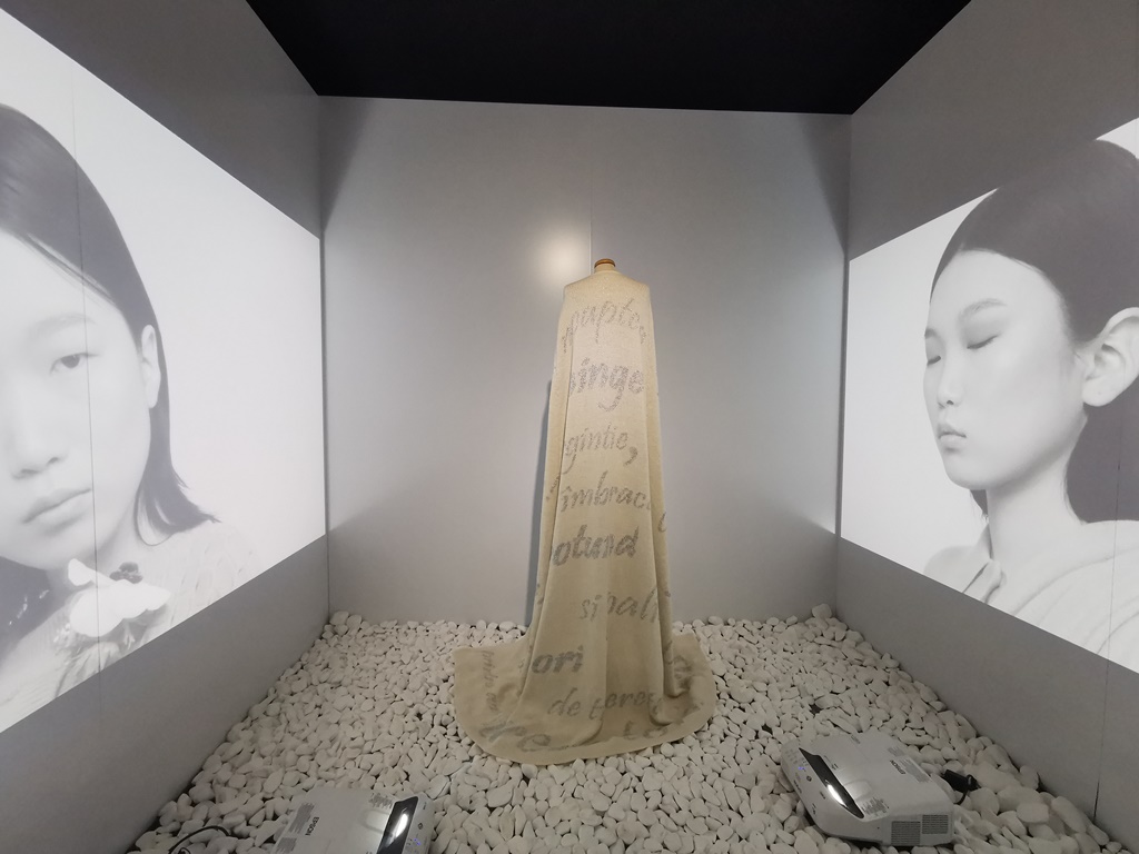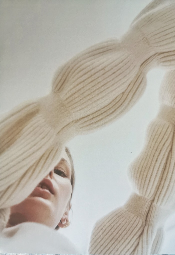 Un spațiu purificat de lumină și alb în care trona o capă lungă, tricotată cu un text poezie care ne spune povestea albului asociat, cel mai adesea cu iarna- ca punct de pornire a ingenuității și copilăriei.