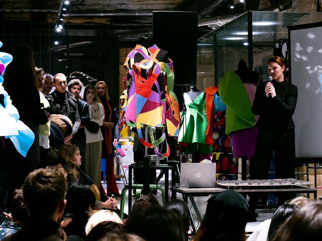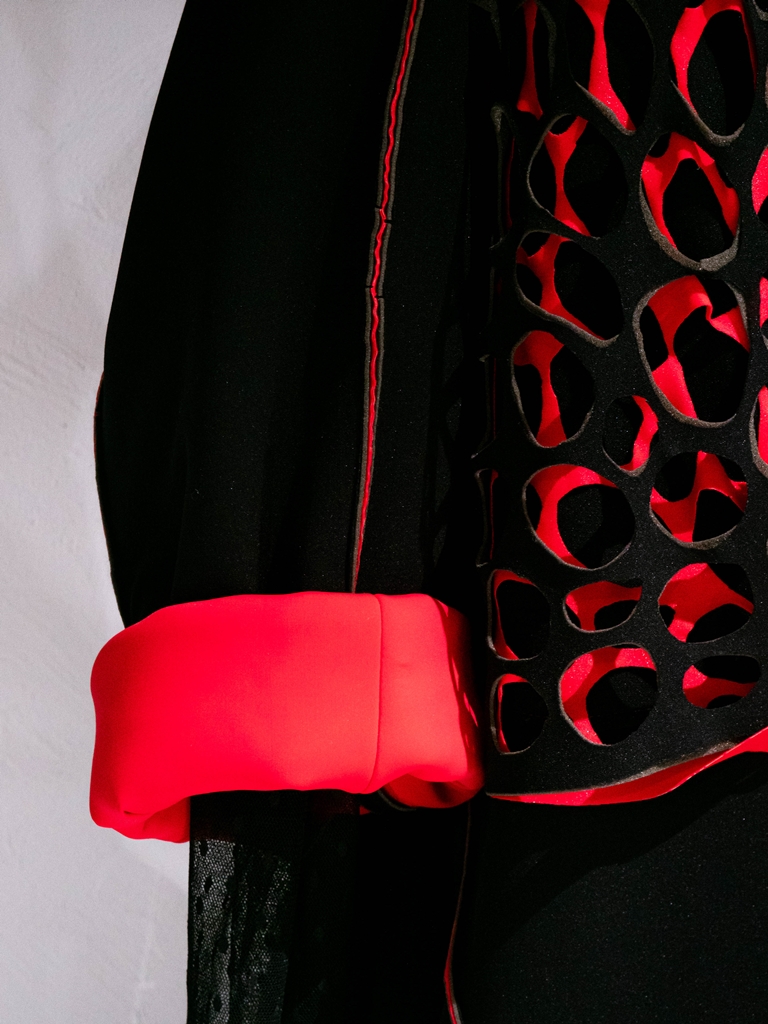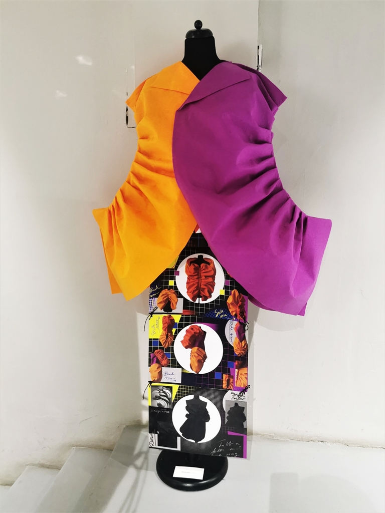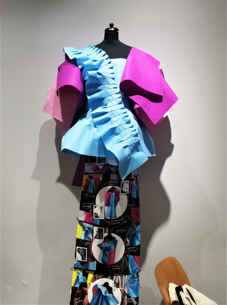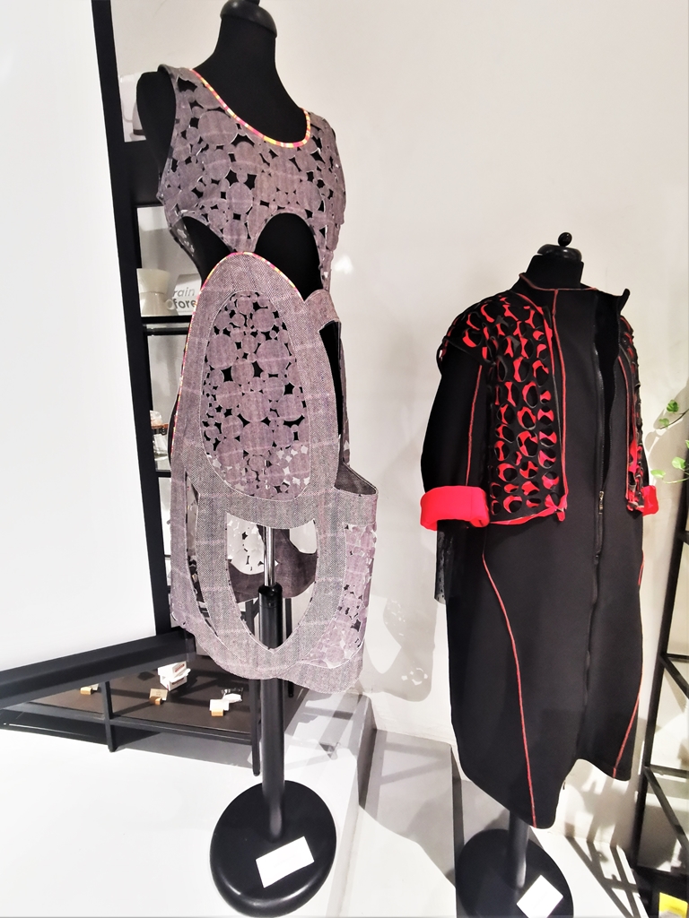 Împreună cu lucrările studenților am regăsit exponatele sofisticate realizate în tehnici hibrid ce îmbină laser cut și digital print – pentru că tot vorbim despre tehnologie – ale asistentelor departamentului de modă, Anca Luiza Zaharia și Kiss Gyongyver, despre care am mai vorbit în vară, cînd am prezentat expoziția din cadrul Tiff.
