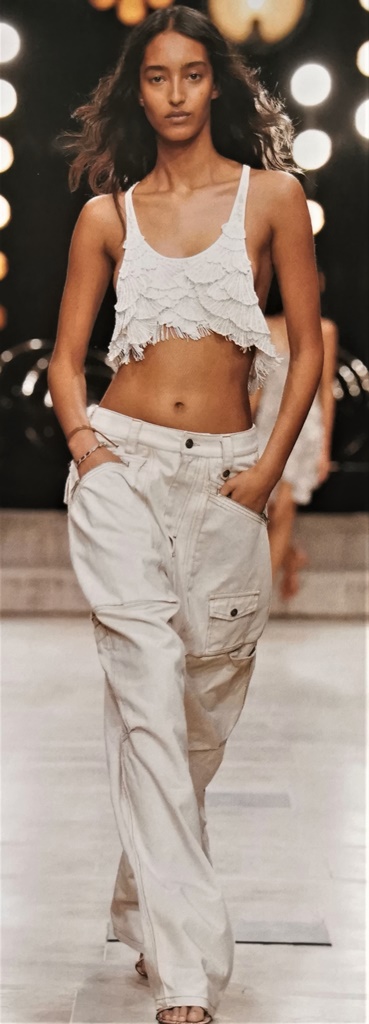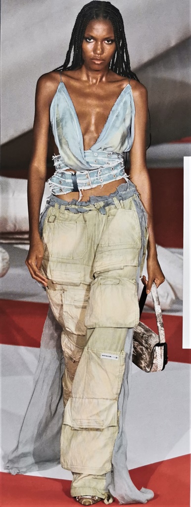 Diesel propune o variantă extrem voluminoasă, ce creează vizual senzația unei plapumi matlasate, în combinație cu topuri scurte și sumare, pentru un echilibru al volumelor. La Fendi găsim un tip mai rafinat de cargo pants, realizat din mătase, cu o linie fluidă și buzunare aplicate dar fără burduf, așa cum sunt și cei de la Coperni, de pildă, virați pe o direcție mai elegantă, mult mai accesibilă pentru purtare.