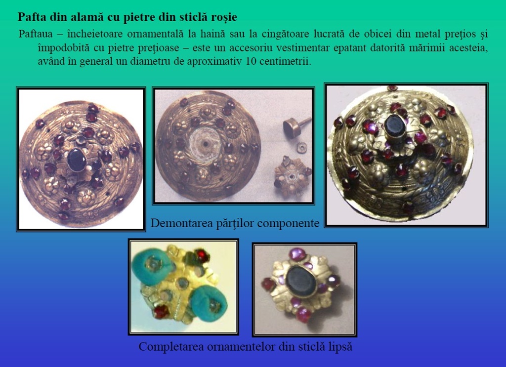 Vreau să menționez și una din primele piese din patrimoniul MET restaurate de mine, o pafta din alamă cu pietre din sticlă rubinie, fațetată care imită granatele și care prezintă produși de coroziune activi ai cuprului și pietre lipsă, restaurată în anul 2004. Ea va fi expusă în cadrul expoziției temporare alături de povestea restaurării ei după care își va relua locul în deposit, alături de celelalte “surori”.