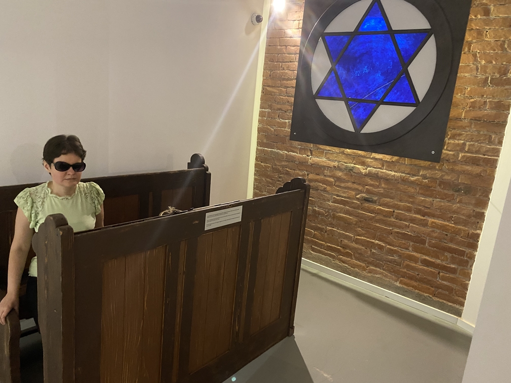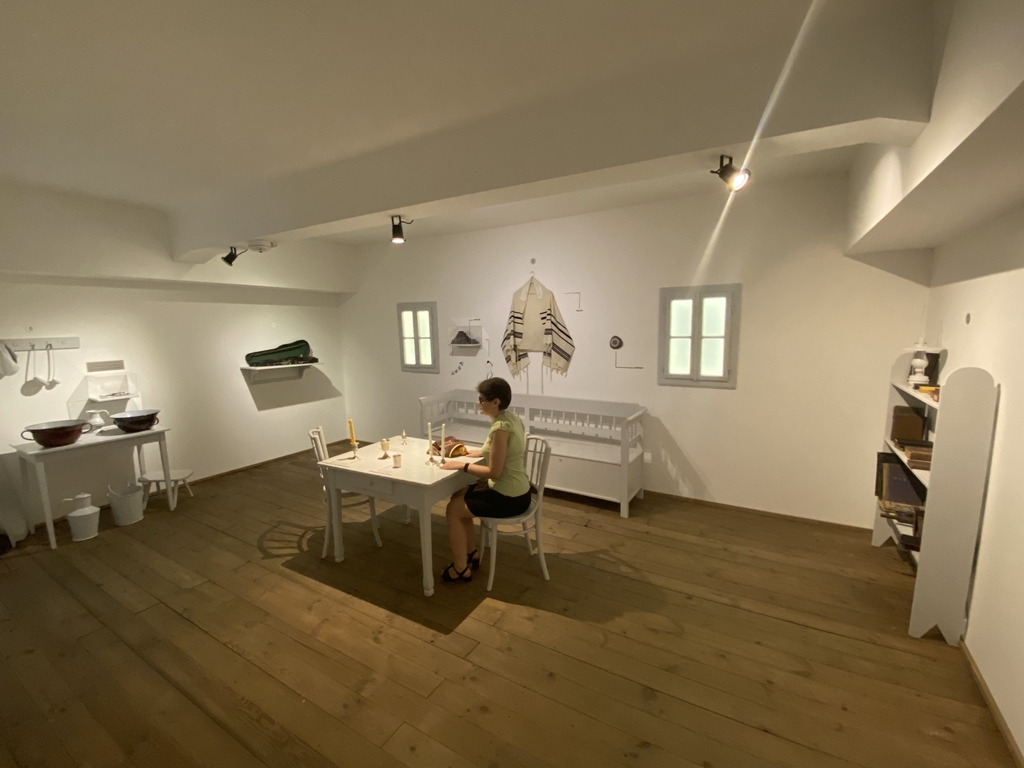 Evelin Ciocan: În faţa noastră este o bancă. Deasupra ei este un tallit, kippa (cu care se acoperă capul) şi tefillinul (o curea de piele care e legată de mâna stângă). Cele trei obiecte au legătură cu viaţa religioasă. În mijlocul camerei avem o masă de Şabat, cu lumânări, cupă de kidush şi o cutie de besamim, cu scorţişoară şi cardamom. Pe un raft avem o vioară şi un clarinet. De obicei la recepţie, când muzeul e deschis, se aude muzica klesmer, cu instrumente cu coarde şi de suflat.