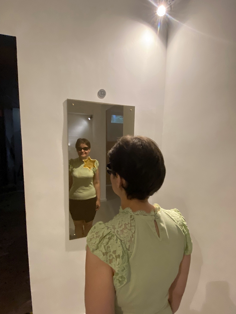 Evelin Ciocan: Pe pereţi sunt lipite tot felul de articole antisemite. Pe un perete avem nişte mâini, care arată toate cu degetul în aceeaşi direcţie. Locul înspre care arată e o oglindă, pe care e lipită steaua lui David. Astfel, dacă te uiţi în oglindă, te vezi cum erau evreii: cu steaua lui David în piept şi toată lumea arătându-te cu degetul.
