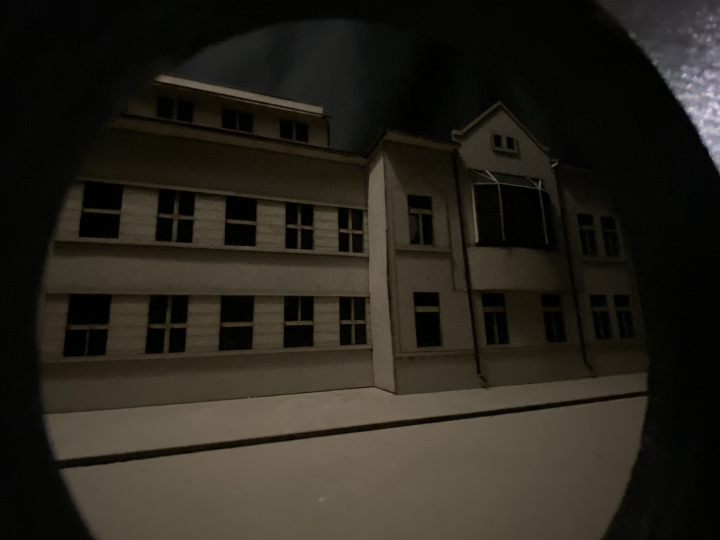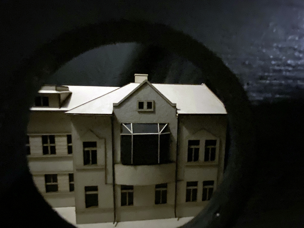 Evelin Ciocan: Din tavan atârnă o cutie neagră, cu găuri făcute pe fiecare latură, pentru a vedea ce e înăuntru. Pe o latură avem macheta spitalului evreiesc din Cluj, iar pe cealaltă un teatru, ca o trimitere la Jenő Janovics. El a fost directorul Teatrului Naţional din Cluj, dar activitatea de cineast l-a făcut cunoscut pe o scară mai largă. Avem nişte ochelari VR pentru a explora felul în care evreii au contribuit la arhitectura clujeană: sunt poze vechi din Cluj suprapuse cu poze noi, în care apar tot felul de palate şi clădiri din oraş (printre care şi Biblioteca Centrală Universitară). Pe ultima latură a cutiei sunt tablouri realizate de artişti evrei din Cluj. Unele, precum Pesimism de Alex Leon, au o tematică tristă, dar sunt foarte expresive.