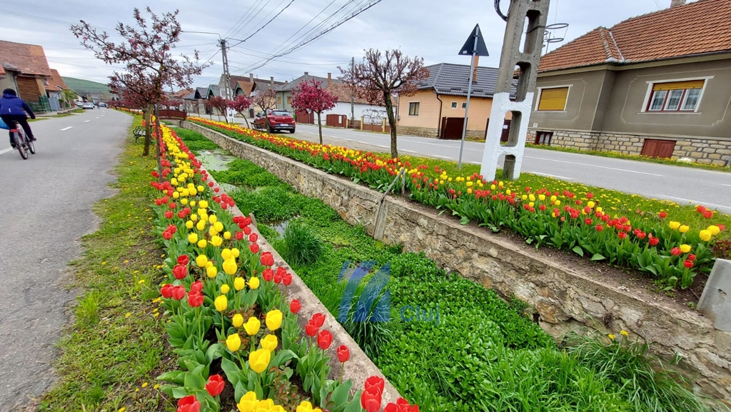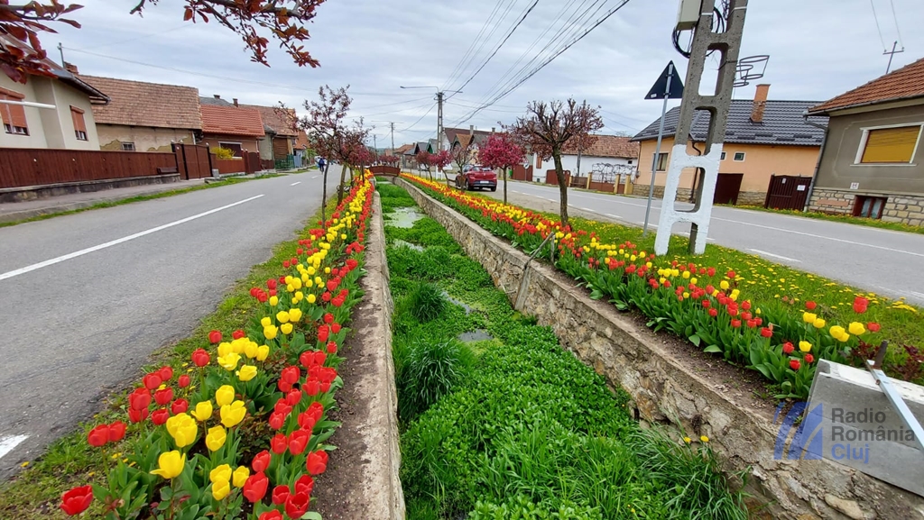 Andrei Poka: Cam de 10 ani am pornit programul de comună înflorită în urma căruia am montat ghivece de mușcate curgătoare pe stâlpii de electrica în toate cele cinci sate, câte două ghivece pentru fiecare stâlp. În următoarea etapă,am creat niște rondo-uri și în fața caselor am plantat peste 15.000 de tulpini de trandafiri și având în vedere că trandafirii la sfârșit de mai înfloresc, am încercat să mai aducem puțină culoare până la înflorirea lor și acum 2 ani am plantat peste 60.000 de bulbi de lalele care înfloresc de Paști, deci în cursul lunii aprilie. Cam ăsta este programul cu comuna înflorită, încercăm să dezvoltăm acest program, evident.