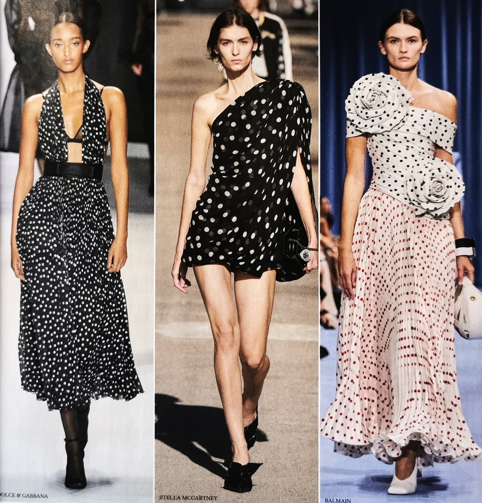 Tot un fel de ocheți, doar că nu perforați sunt și bulinele, de mare suuces în acest sezon. Bulinele sunt oricând opțiunea ideală pentru o declarație de feminitate. Aici nu mai vorbim despre textură ci despre print. Combinațiile de buline albe pe fond negru sau negre pe fond alb, clasice prin excelență, cu un caracter cinematografic indiscutabil se regăsesc pe rochii din voal și mătase la Dolce&Gabbana sau Stella Mc Cartney. Balmain vine din nou cu propuneri inedite în care combină topuri fronsate asimetrice albe cu buline mici negre cu fuste plisate albe cu buline roșii pentru crearea unui efect grafic aparte.