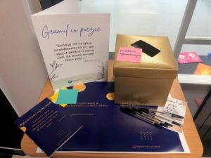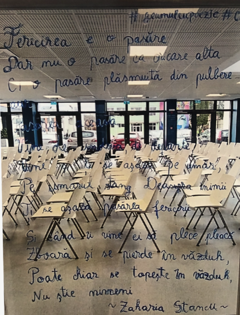 Inspirată de ideea ”geamului cu poezie” a lui Gabriel Bota (directorul artistic al Festivalului Internațional de Carte Transilvania), d-na profesoară i-a provocat pe elevi să iasă din tipare, să fie sensibili, să-și imagineze, să creeze, să înțeleagă.
