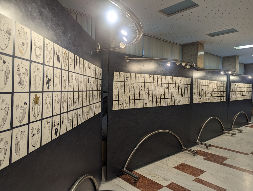 400 de inimi alb-negru de mici dimensiuni, pe foi albe, sunt expuse privirilor noastre cu tot ce au ele înăuntru.