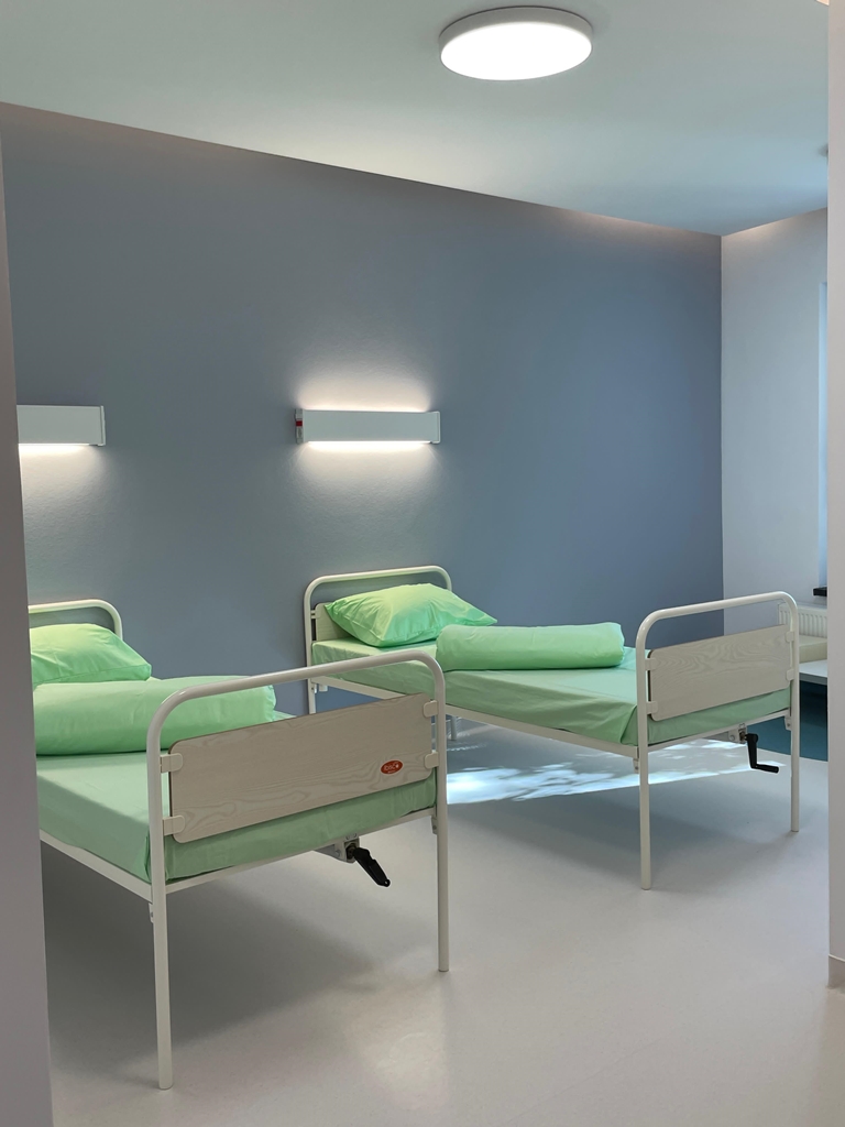 La parter este compartimentul de spitalizare „de o zi”, cu o capacitate de 15 paturi și spațiul ambulator pentru servicii medicale oferite celor care nu necesită internare. La primul etaj se regăsește compartimentul de spitalizare permanentă, cu 30 de paturi, împărțit în nuclee de îngrijire în funcție de vârstă, dar și încăperi destinate activităților medicale și sala de ergoterapie pentru activități creațional-educative.
