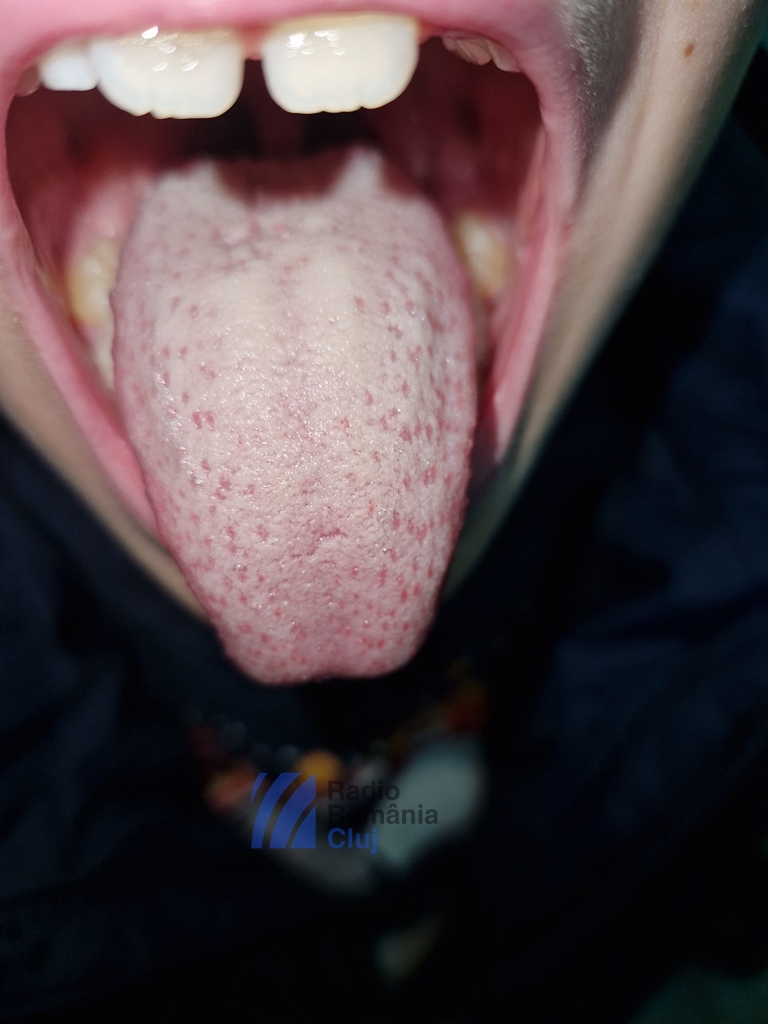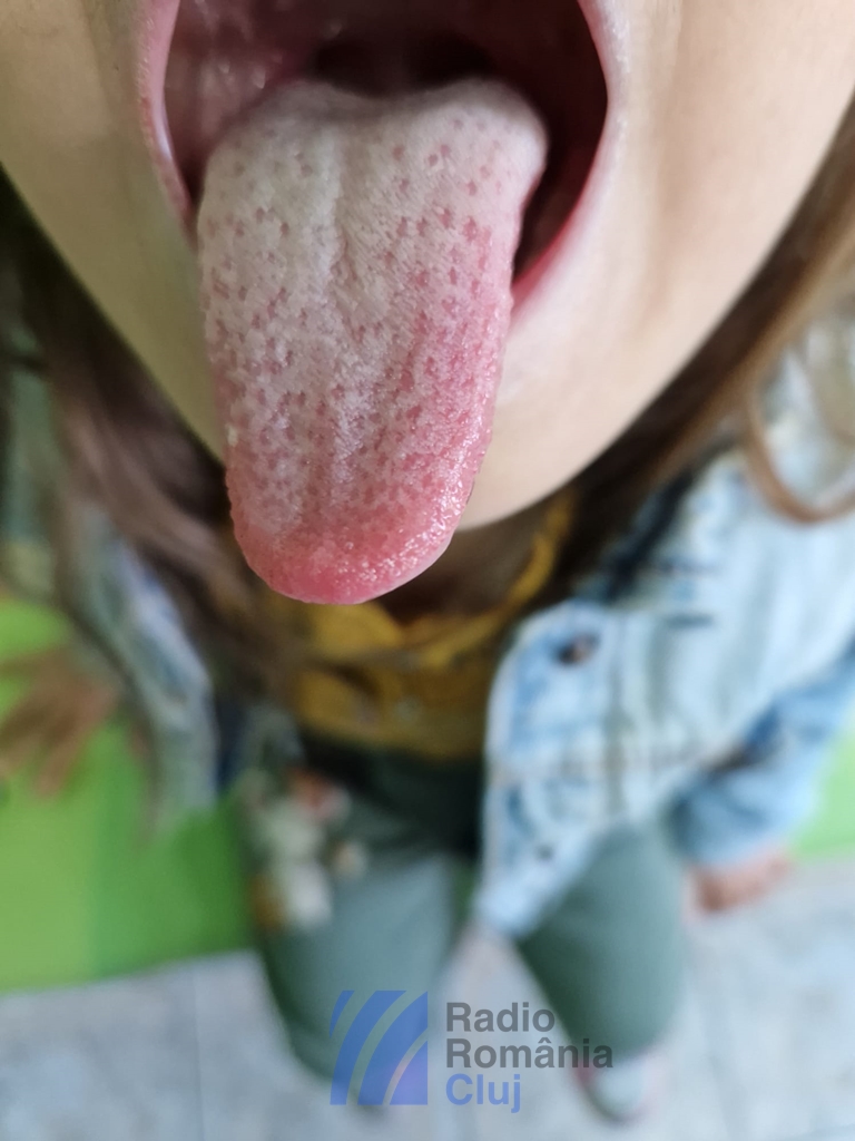 În aceste zile ne confruntăm, la nivelul cabinetelor medicilor de familie, cu foarte multe cazuri de infecție streptococică care se manifestă prin dureri faringiene, prin febră ridicată – 39/40, uneori prin vărsătură, prin stare generală modificată. Iar primul semn obiectiv clinic care îl pot observa părinții este așa-numitul aspect al limbii numită limbă zmeurie. Deci limba arată ca și cum ar fi o căpșună, o frăguță, o zmeură. Dar, la început, limba este încărcată, este așa-numită limbă de porțelan, începe să se descoameze la nivelul părților laterale, se pierde un strat și rămân papilele gustative la vedere.