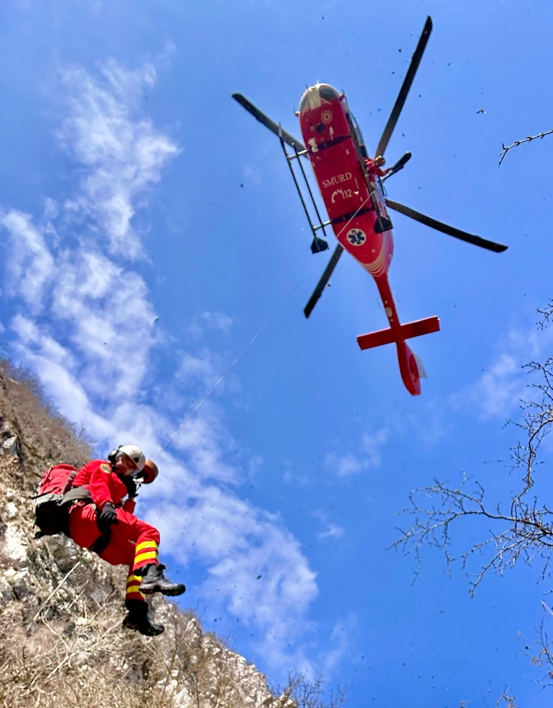 Elicopterul SMURD a sosit deasupra defileului, a lansat pe cablu un salvator, care împreună cu cei trei salvamontiști au pregătit victima pentru trolierea în elicopter.