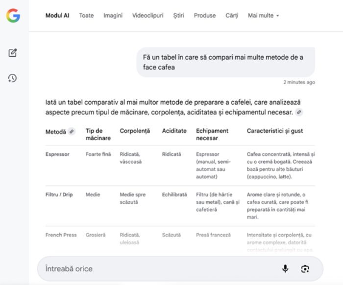 Noua funcționalitate a Google este utilă în explorare și sarcini mai complicate, precum compararea de produse, planificarea călătoriilor sau răspunsul la întrebări complexe de tipul „cum să”. De exemplu: „Fă un tabel în care să compari mai multe metode de a face cafea”. – Ana Pădurariu, communication manager Google România