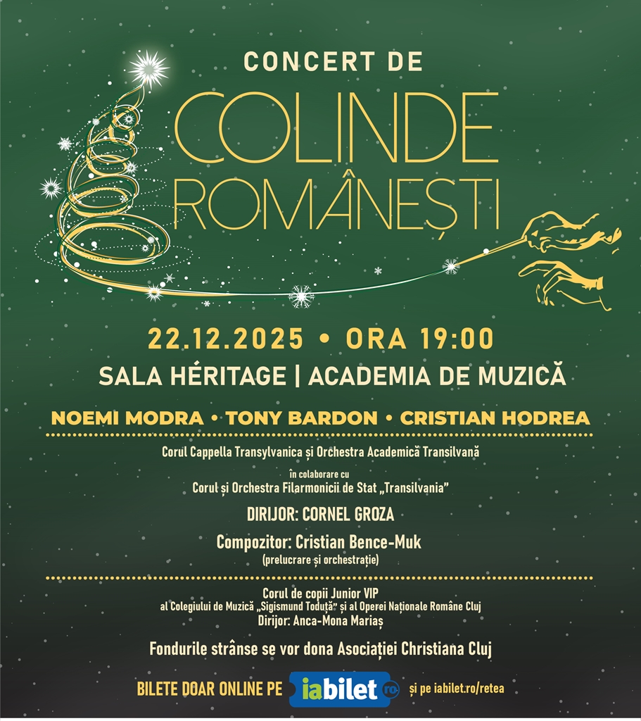 Cea de-a 11-a ediție a Concertului caritabil de colinde românești va avea loc în 22 decembrie, de la ora 19, și aduce o premieră: primul concert al seriei găzduit în noua Sală Héritage a Academiei de Muzică din Cluj-Napoca.