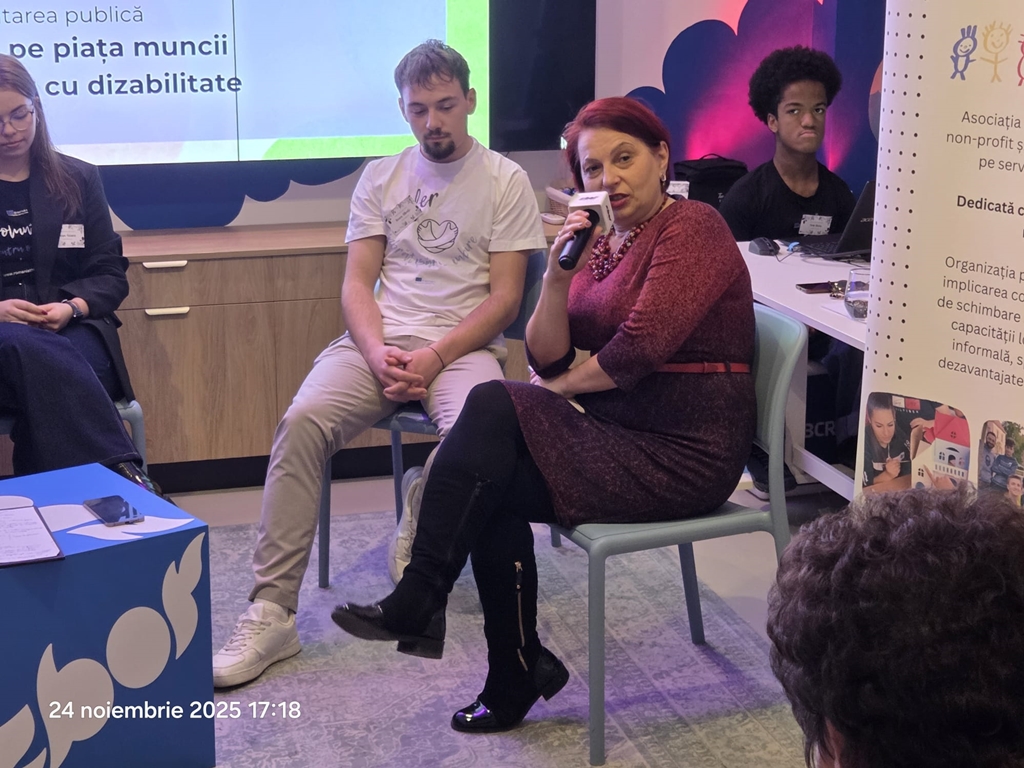La evenimentul de la începutul acestei săptămâni, printre vorbitori s-a aflat și profesoara Georgeta Răduţiu, cadru didactic al Colegiului Economic „Iulian Pop” și persoană cu dizabilități: