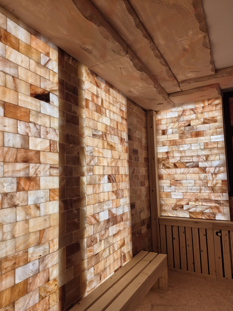 Aceasta include placarea pereților cu sare naturală, cărămizi de sare dispuse estetic și funcțional, pentru a contribui la ionizarea aerului și un sistem audio pentru meloterapie.