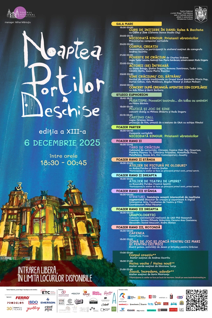 Teatrul Național „Lucian Blaga” din Cluj-Napoca organizează sâmbătă, 6 decembrie, de la ora 18:30, o nouă ediție a Nopții Porților Deschise.