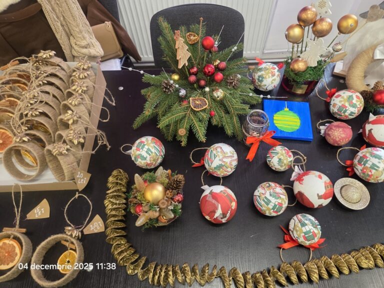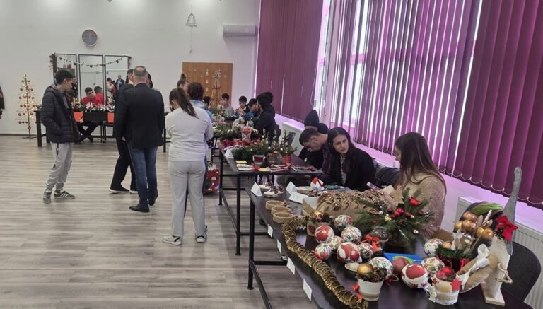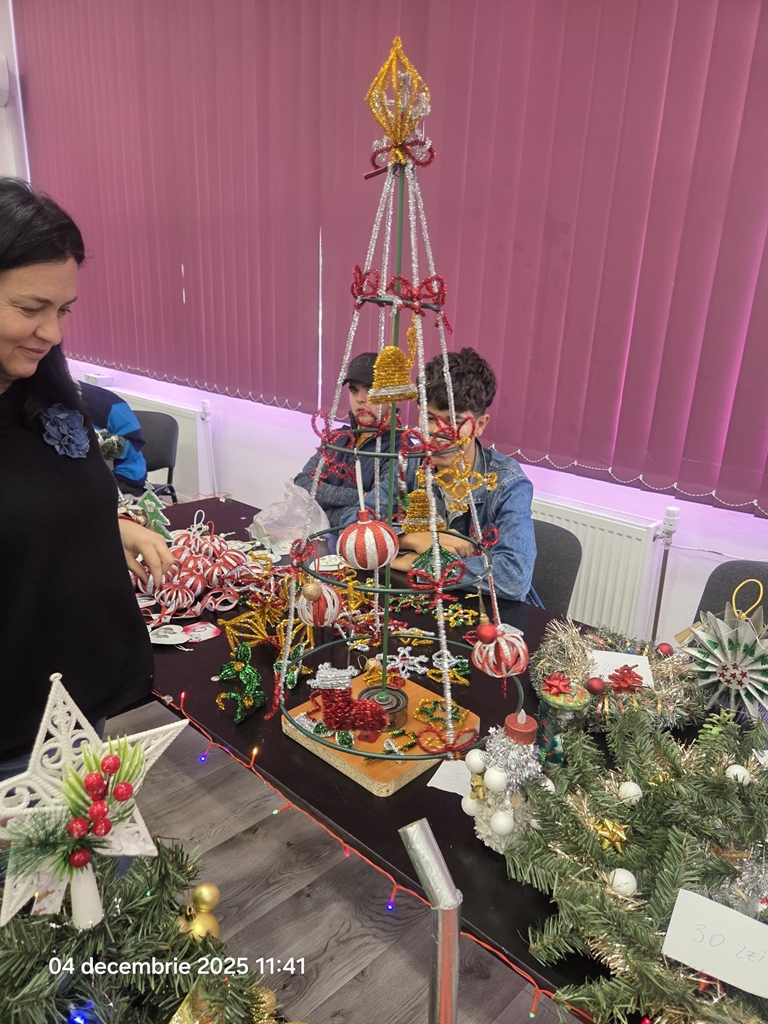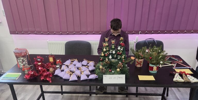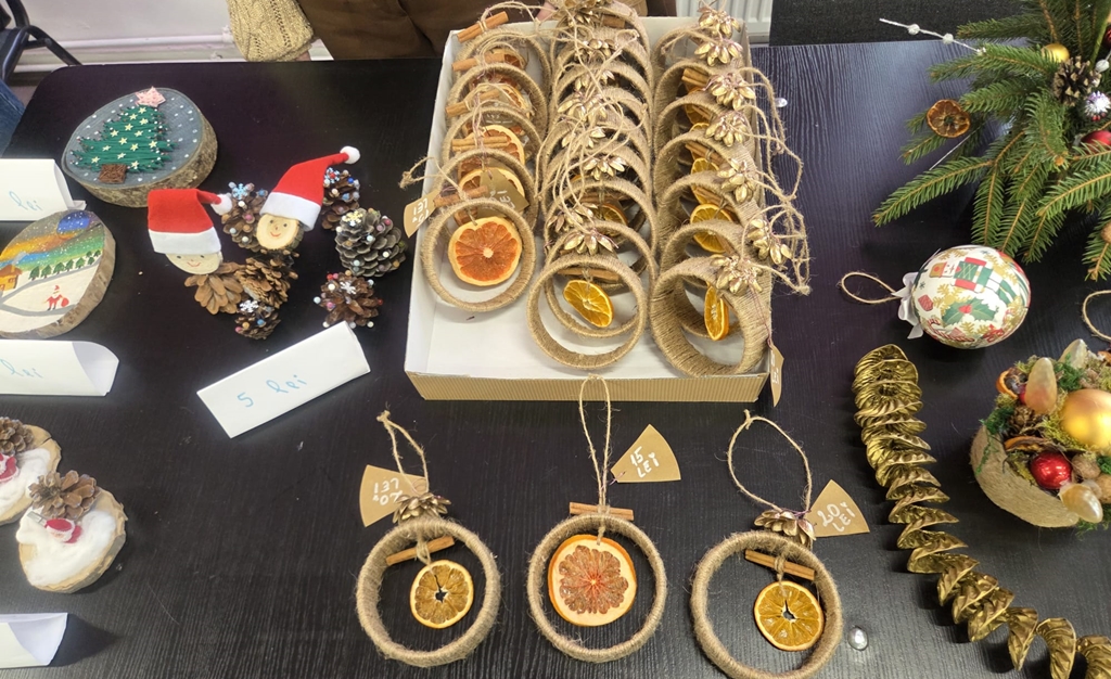 Elevii cu dizabilități expun dulciuri, ornamente și trenulețe din materiale reciclate.