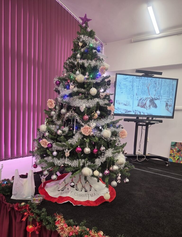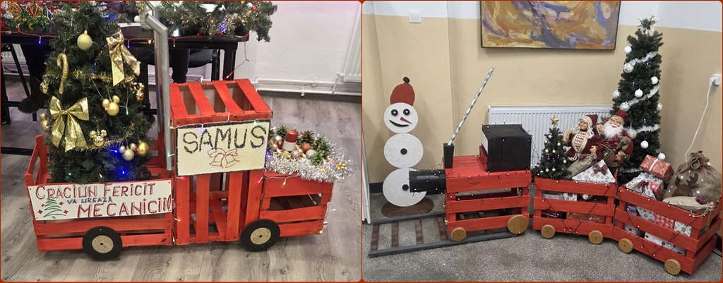 „Trenulețul nostru vesel e făcut din scânduri luate din euro paleți și alte bucăți de lemn, totul refolosit. Nu s-au lăsat până nu au făcut și șine și horn care scoate fum. Locomotiva e făcută dintr-un taburet vechi, iar înăuntru sunt cadouri, Moș Crăciun și Doamna Crăciun”, explică Teofana Sferle, director adjunct.