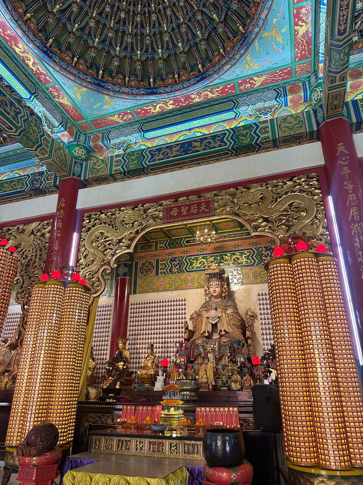 Intrarea principală a templului are o poartă cu mai multe arcade și stâlpi roșii, culoarea simbolică a prosperității și a norocului.