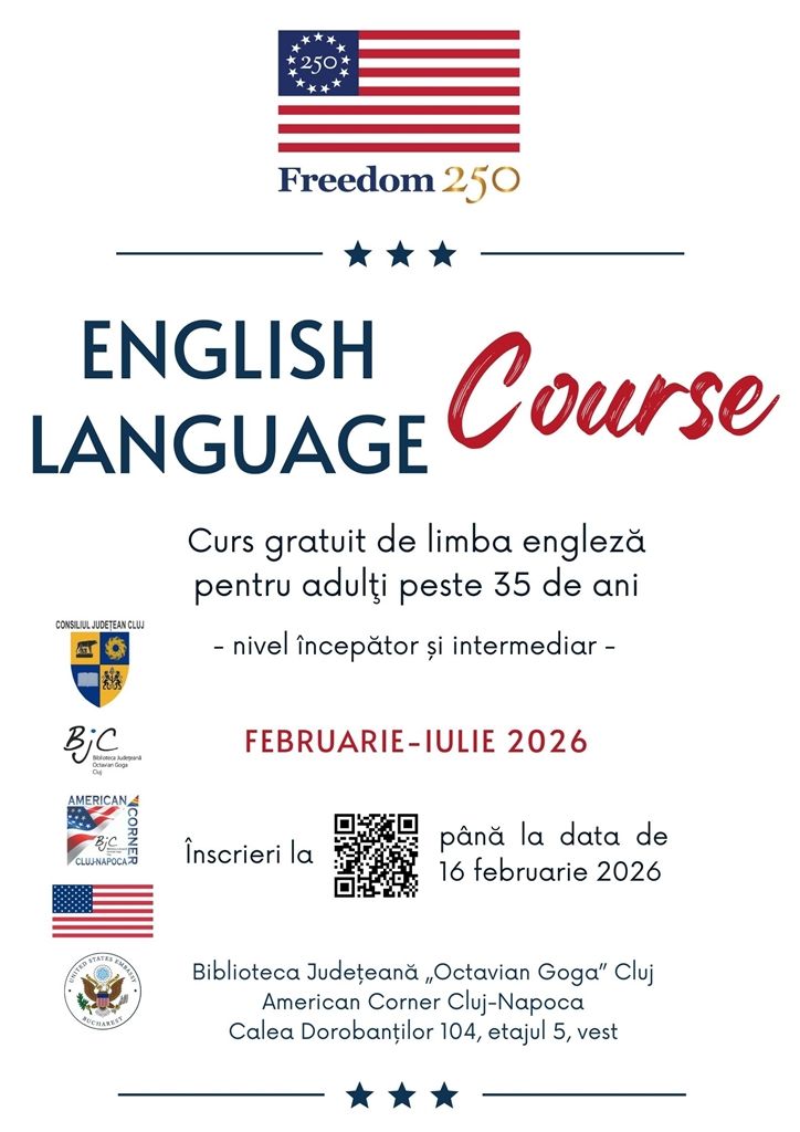 Biblioteca Judeţeană „Octavian Goga” Cluj organizează un curs gratuit de limba engleză pentru adulții cu vârsta peste 35 de ani, nivel începător sau intermediar.
