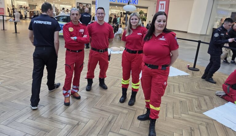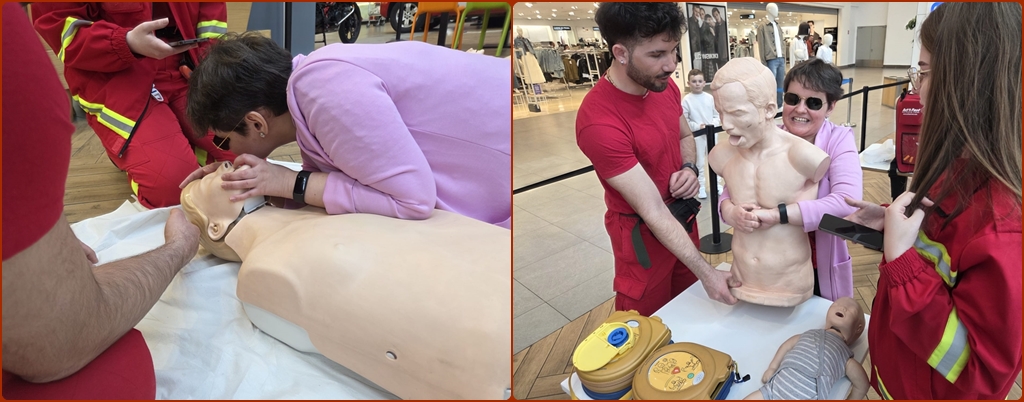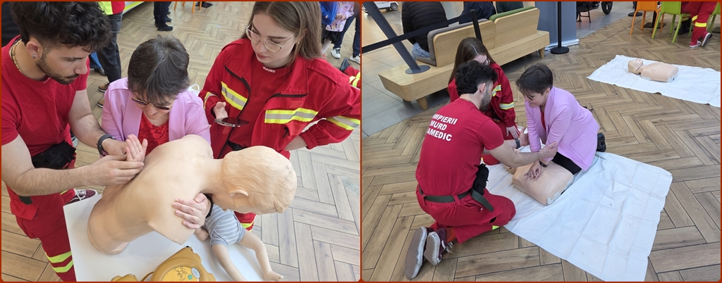 „Astăzi îi învățăm pe oameni tehnici de bază de resuscitare: cum să recunoască un stop cardiorespirator, cum să execute masajul cardiac și respirațiile gură la gură, cum să facă un apel corect la 112”, explică Diana Pintea, studentă în anul IV la Medicină și paramedic coordonator al voluntarilor de pe Ambulanța de Terapie Intensivă Mobilă.