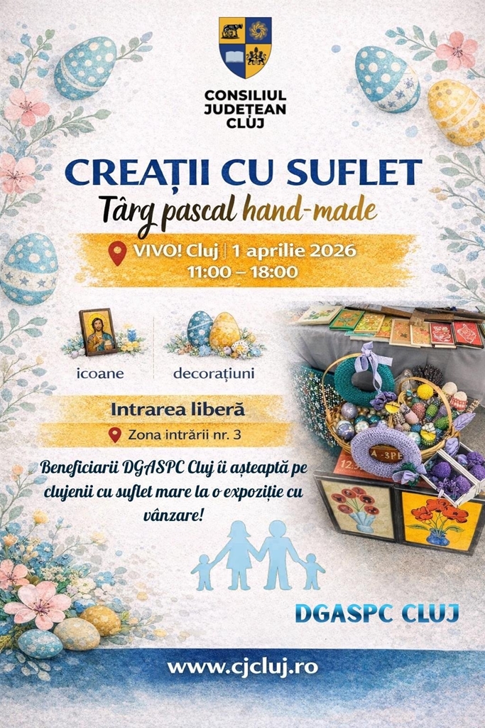 Pentru a marca perioada sărbătorilor pascale, Direcția Generală de Asistență Socială și Protecția Copilului Cluj organizează miercuri, 1 aprilie, un Târg de lucrări hand-made cu vânzare, în incinta mall-ului din Florești.