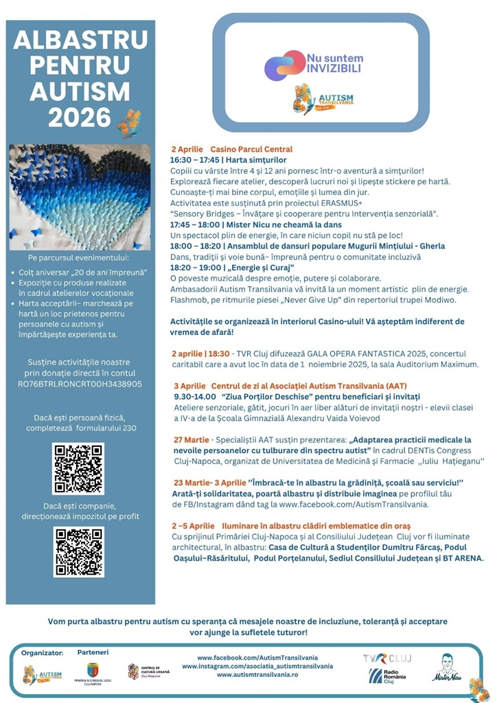 Asociația Autism Transilvania marchează Ziua Mondială a Conștientizării Autismului, pe 2 aprilie, printr-o serie de evenimente dedicate comunității, dar și prin implicarea în campania europeană „Nu suntem invizibili”.