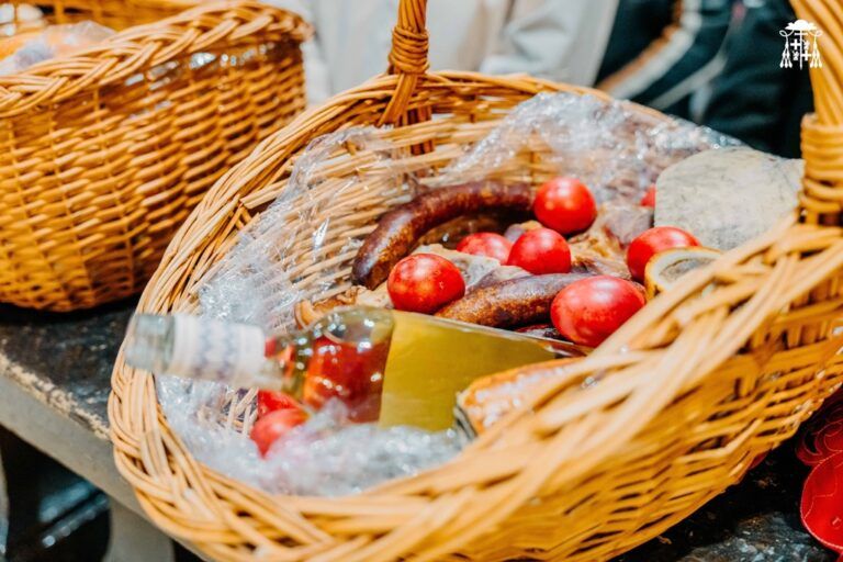Mulți au venit cu coșuri pline, pregătite pentru masa de Paște, pentru a primi binecuvântarea înainte de slujba de dimineață.