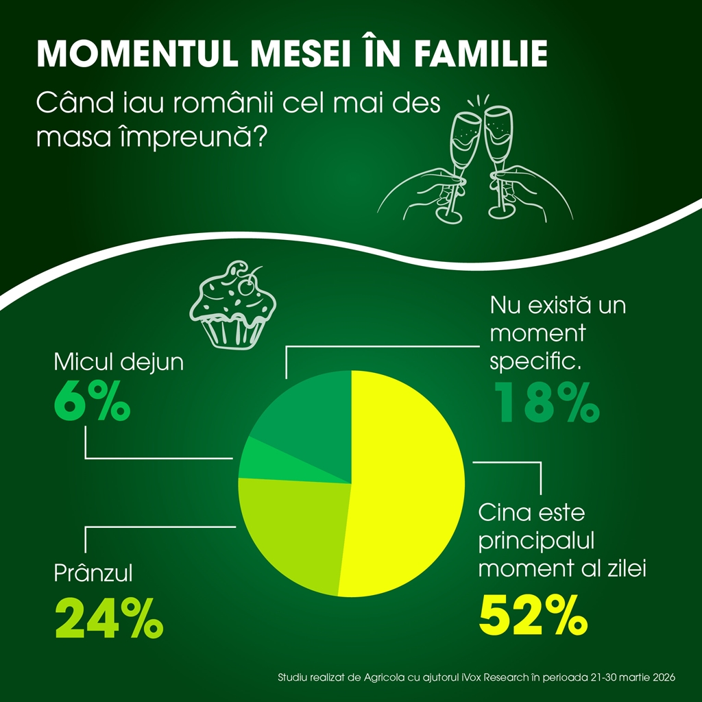 *Studiul „Mesele în familie la români” a fost realizat cu ajutorul platformei iVox Research, în perioada 20-31 martie 2026, pe un eșantion de 1.121 de respondenți adulți din România.