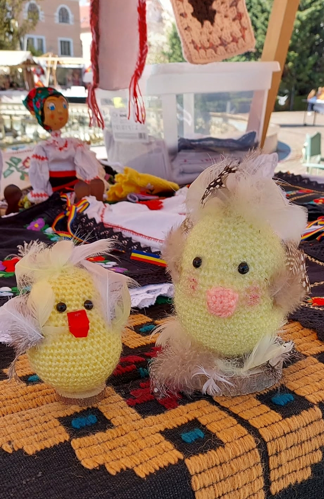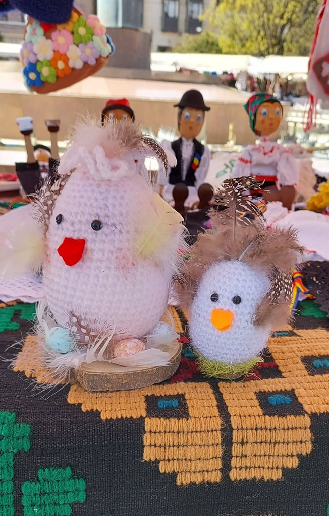 Floarea Alexa: Mă duc cu croșeta, îi dau formă oului. Și m-am uitat de multe ori așa la ou care-i făcut simplu: cred că copiilor le-ar place să vadă altceva. Și atunci, m-am gândit la pene. Pur și simplu la pana de pui. Și atunci le-am lipit frumos, niște pene, le-am pus botulețul ăsta micuț, ochișorii și foarte mulți copii se opresc la masa mea, aici, în târg. Și iată, ouăle, sunt parcă personaje dintr-o poveste. Parcă dintr o poveste, și dacă mi-au plăcut mie, sigur, zic, că o să le placă și la copii.