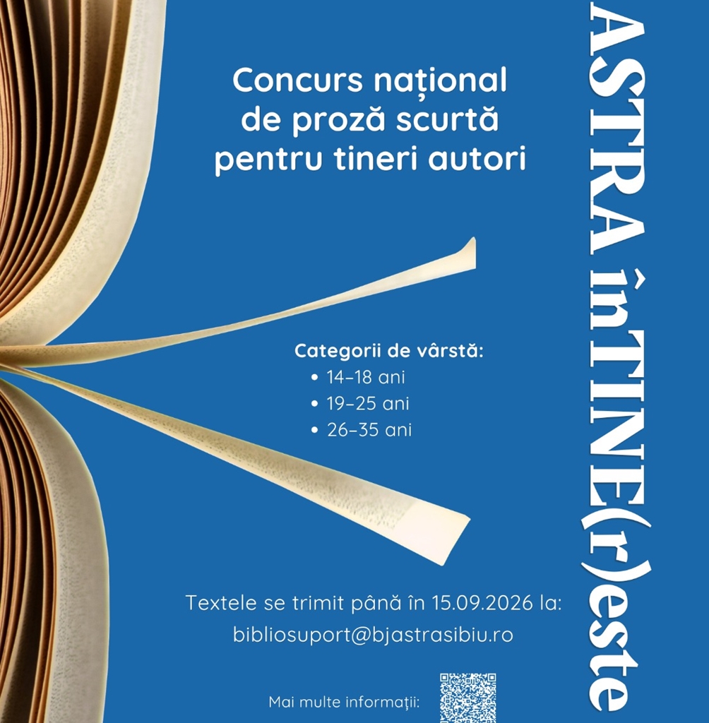 Biblioteca Județeană ASTRA Sibiu lansează concursul național de proză scurtă „ASTRA înTINE(r)este”, dedicat tinerilor cu vârste între 14 și 35 de ani, în cadrul celebrării a 165 de ani de existență a Asociațiunii ASTRA.